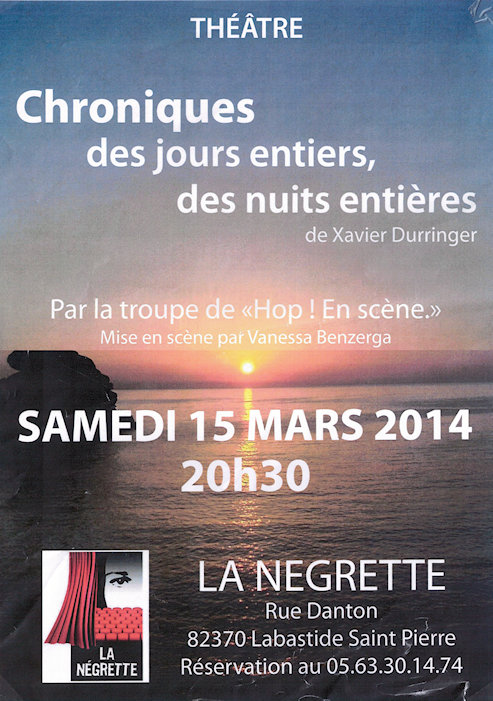 - 15 mars : Représentation théâtrale de l’atelier adulte « Chroniques des jours entiers, des nuits entières. » de Xavier Durringer à la Négrette à Labastide-Saint-Pierre.